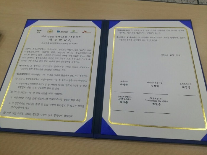 이를 위해 우리 오산시는 유시티통합운영센터를 지난 2013년 12월 개소하였습니다. 개소된 이래로 각종 재난과 범죄 해결은 물론 예방의 초병 역할을 묵묵히 우리 시민들을 보호 해주고 있는데요, 29일 전국 최초로 국토부 통합플랫폼 기반 5대안전서비스 구축을 위해 오산시, 화성동부경찰서, 오산소방서, 한국토지주택공사, SK텔레콤이 함께 업무협약서를 체결하였다고 하여 소식 전해드리려고 합니다.