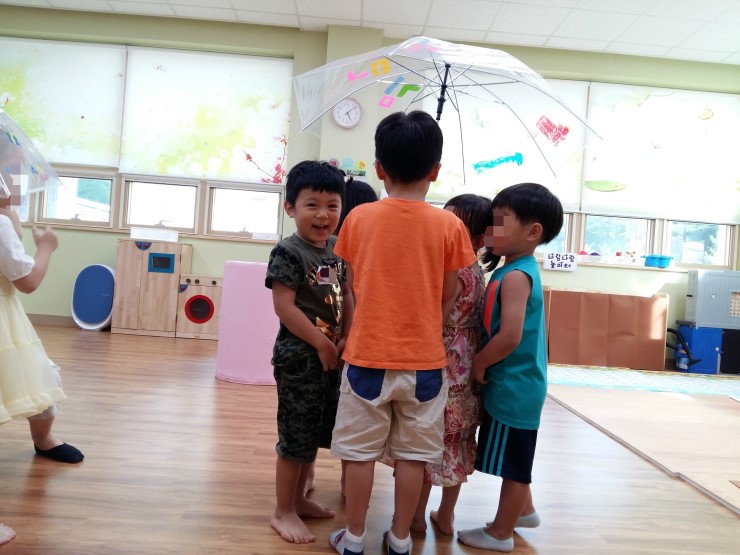 정말 비를 피하듯이 하나의 우산 안에 웅크린 아이들의 모습이 사랑스럽지 않나요?