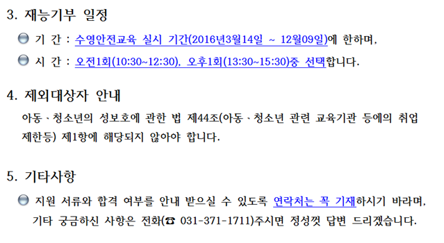 왜냐하면, 수영강습을 위한 기본교육과 수상안전교육을 미리 받아야하기 때문이지요. 또한 월 5일 이상 자원봉사가 가능하여야 합니다.