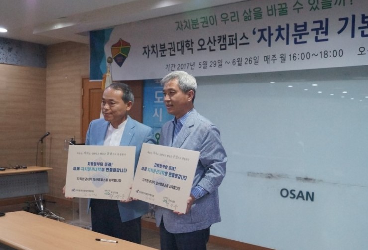이어서 자치분권협의회 김윤식 회장과 오산캠퍼스 곽상욱 학장 간의 협약식이 거행됐다.