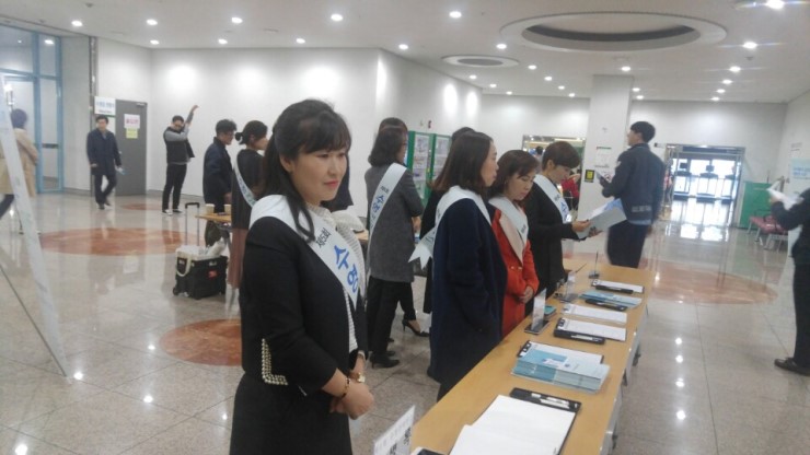 ▲ 행사 30분 전 준비를 마치고 대기하고 있는 오산 학부모 교육자원봉사들 학부모 교육자원봉사로 올해 처음 참여한 수청초 이효임 회장은 "작년에는 학부모 회장 자격으로 관객석에 앉아 있었다. 그래서일까? 수영컨퍼런스에 대한 기억이 없다. 하지만 올해는 오산지역 중·고등학교 선배 학부모회와 뜻깊은 행사에 함께 참여하게 되어 기뻤다.