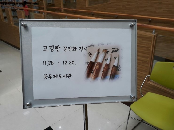 원화 전시 아래에는 11월 26일부터 12월 20일까지 문인화 전시도 하고 있습니다. 꿈두레도서관의 계속되는 전시로 도서관을 방문하는 시민들에게 다양한 볼 거리를 제공하기에 시민들의 문화 수준도 점점 업그레이드 되는 것 같습니다.