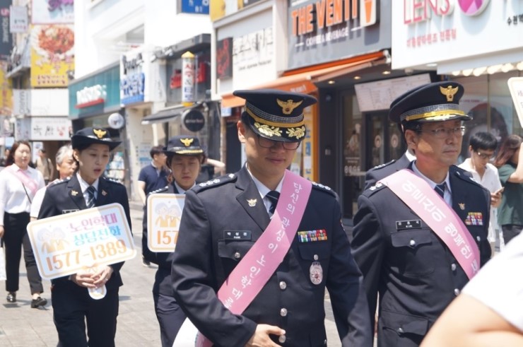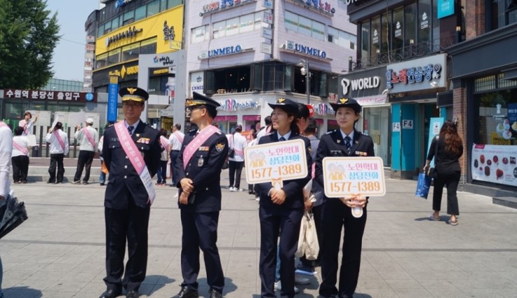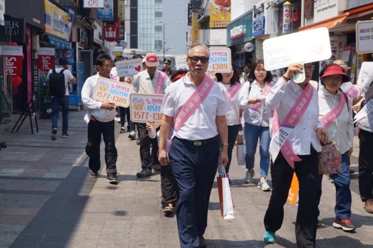 ▲행사에 참여한 오산노인복지관 상담 봉사자가 기념 촬영을 하고 있다. 이날 행사는 노인학대 예방 동영상 시청과 협약기관인 경기남부지방경찰청, 대한노인회 경기도연합회, 경기중앙 지방변호사회와 경기도의 업무 협약서 서명과 노인학대 예방 홍보 활동으로 수원역과 로데오거리에서 거리 홍보 활동 캠페인을 벌였다.