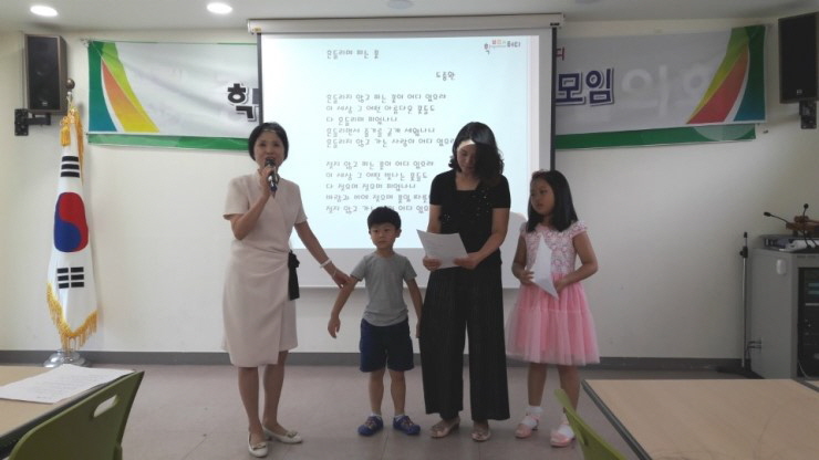 ![]() 배명숙리더가 이기철 시인의 <내가 바라는 세상>을 낭독했고 이어서 이승미선생님이 자녀인 정원이(고현초2), 휘성이와 함께 나와 시를 외웠습니다.