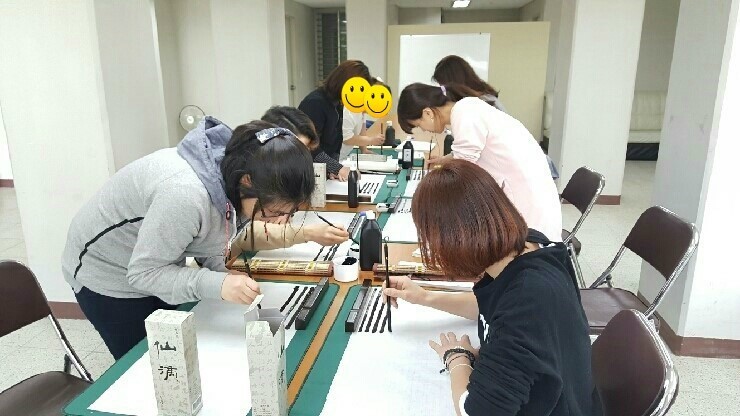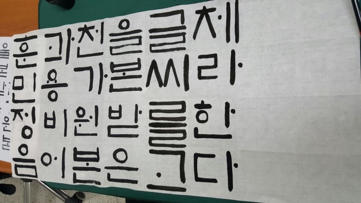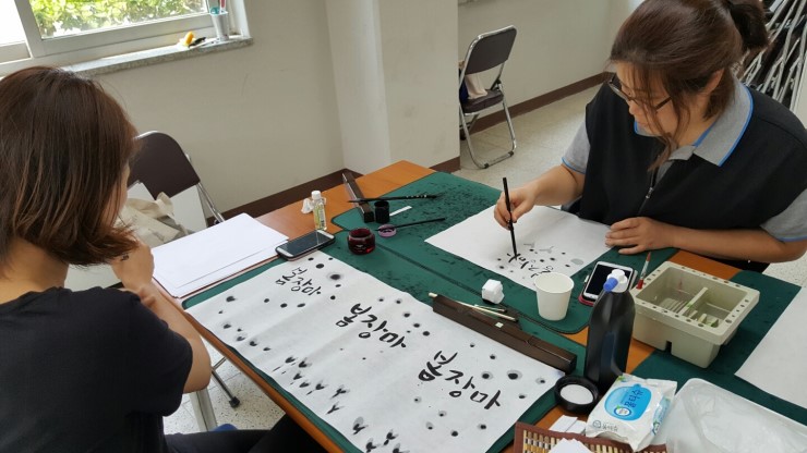 아교를 이용한 번짐효과를 배우고, 붓이 아닌 다른 재료를 활용한 글씨쓰기를 배웠습니다. 나무젓가락, 면봉, 스펀지, 수세미 등 다양한 재료들로도 글씨를 멋스럽게 쓸 수 있다는 게 참 신기했습니다.