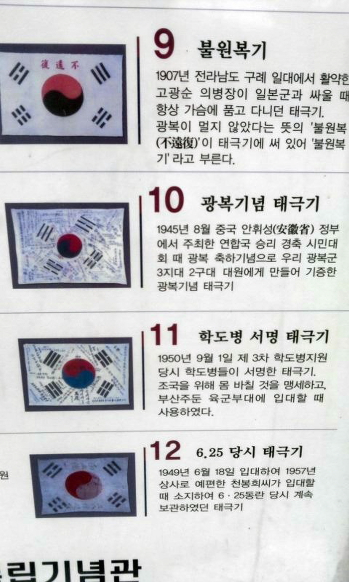 저는 아이들과 독립기념관을 종종 찾는데요. 독립기념관 앞에 태극기 동산이 있고, 근대 역사 속의 여러 모양의 태극기 안내가 있어요. 예전에 방문했을 때 찍은 것 중 하나를 올려요. ![]() 독립군들이 전쟁 중 항상 가슴에 품고 다녔던 태극기. 태극기는 단순한 그림이 아니었습니다.