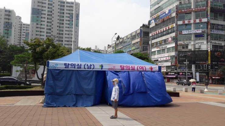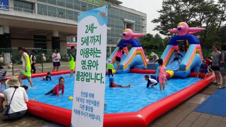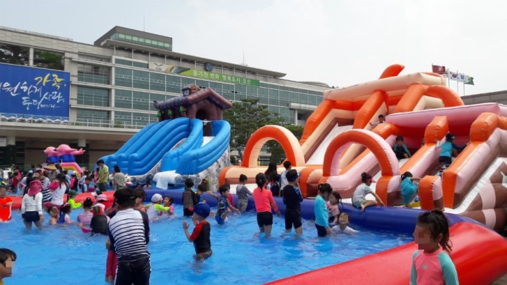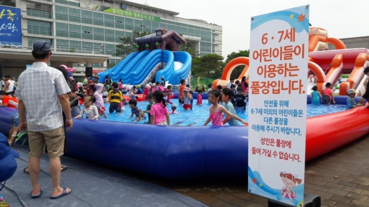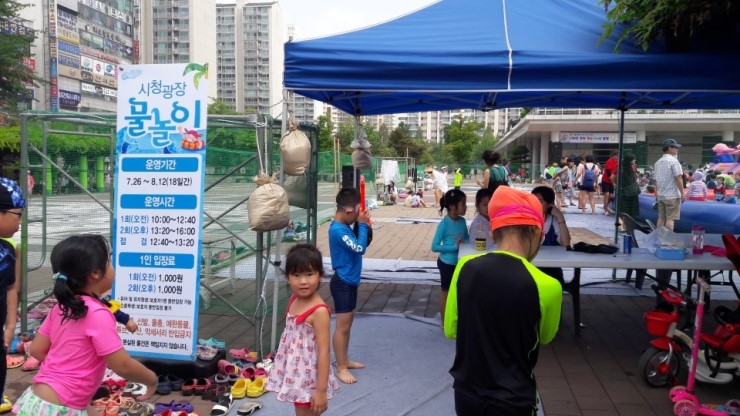 아이들이 방학을 맞았으나, 바깥 더위가 무서워 방콕만 하던 저는 시청 앞에 볼일을 보러 아이들과 나갔다가 시청 물놀이장을 아이들에게 들키고 말았지요.