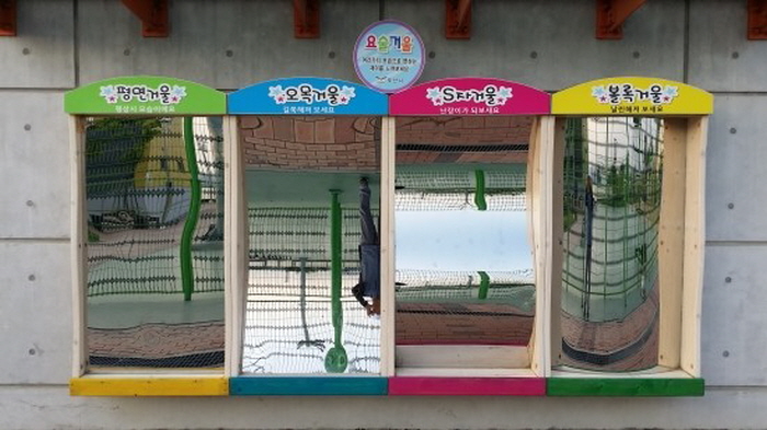 옆에 설치되어 있는 여러 가지 모형으로 보이는 거울은 나를 어린세상으로 돌아가게 하였고, 그 뒤편에 자리 잡고 있는 그네는 그 시절 동구 밖 큰 나무 아래서 그네타며 놀던 시간들을 생각나게 하였다.