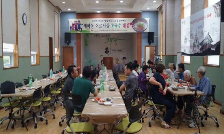 ▲ 세마동 어르신들이 고소한 냉콩국수로 점심식사를 하고 있다.