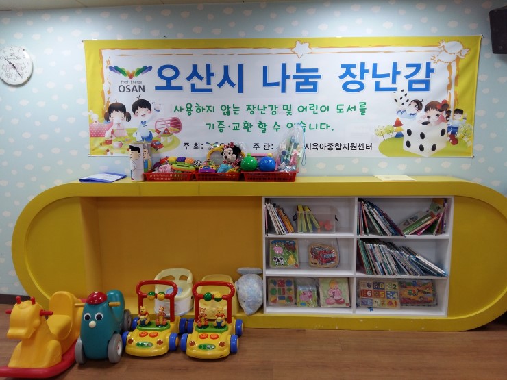 늘어가는 장난감들 중엔 분명 아이가 더 이상 갖고 놀지 않는 장난감도 자리하고 있습니다. 우리 아이에겐 필요하지 않은 장난감이지만, 다른 아이에겐 흥미로운 장난감이 될 수도 있습니다. 집에 휴면 장난감이 있다면 나눔코너를 이용해보시면 어떨까요? 오산시에는 각 가정에서 사용하지 않는 휴면 장난감을 기증하거나 다른 장난감으로 교환하는 나눔코너가 있습니다.