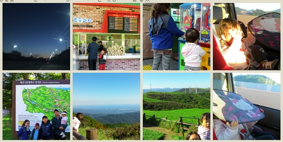 차가 밀릴까봐 동트기 전인 6시 경에 오산집을 떠났다. 고속도로는 뻥뻥 뚫렸으나, 동쪽을 향해 가니 막내가 눈이 부시다며 징징거렸다. 그래서 낸 방안이 햇빛가리개를 얼굴에 데는 것. 하지만, 빛 투과성이 넘 좋구나. 미안하다... ^^