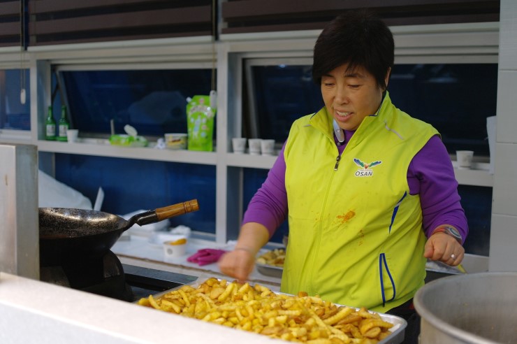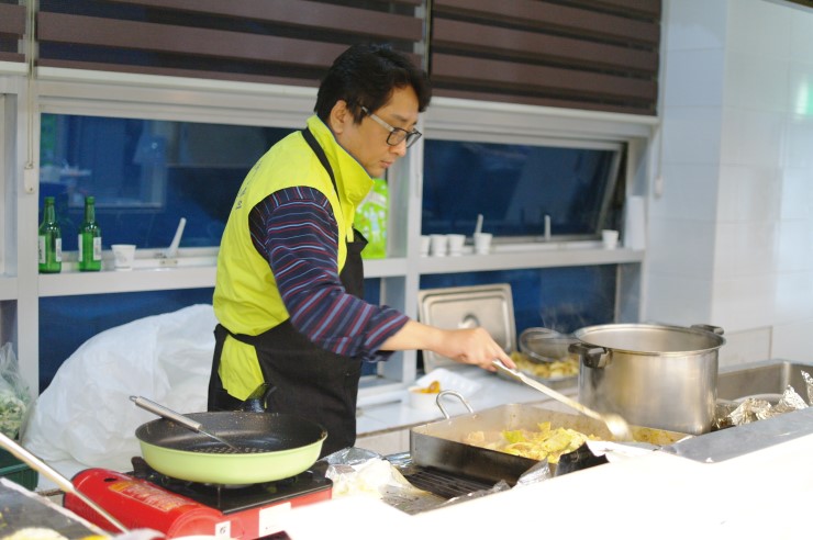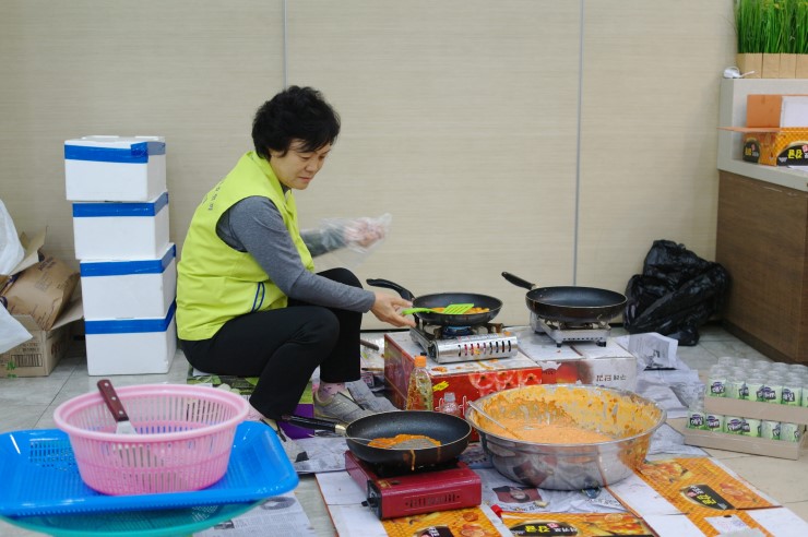 ▲ 아동청소년 보호협회 오산시지회 정선희 회원이다. 음식을 마련하는 손길이 분주하다. 민간 기동 순찰대 여성 대원들과 함께 협회 회원들은 5시부터 10시까지 진행된 행사에 사용될 음식을 준비하였다. 긴 시간 행사를 진행하고 마무리하기까지 몸이 많이 피곤할 텐데 늘 입가엔 웃음이 떠나지 않았다.