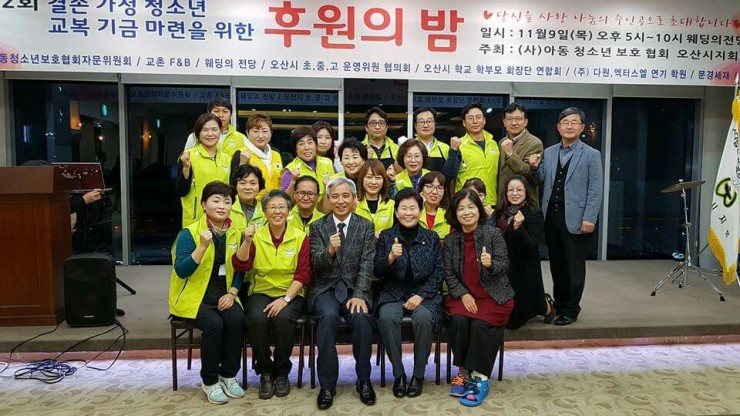 지난 11월 9일 오산 웨딩의 전당에서는 '제2회 결손가정 청소년 교복기금 마련을 위한 후원의 밤' 행사가 있었다. 후원의 밤 행사에는 아동청소년 보호협회 오산시지회 회원뿐 아니라 오산시 민간기동 순찰대 여성 대원분들이 함께 손길을 모아 주었다.