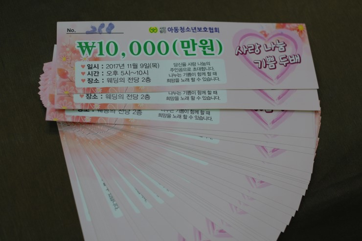 사랑 나눔 기쁨 두 배 초대권이다. 만 원의 행복이 소외계층 학생들에게 전달되어질 그 날이 기다려지는 행사였다. 오늘 행사에는 민간기동 순찰대 여성대원들, 아동청소년 보호협회 오산시지회 회원, 오산 시민 등 많은 사람들의 뜻깊은 수고와 따뜻한 정성이 모였다. 수원 수 여성 병원의 후원까지 풍성한 후원의 밤이었다.