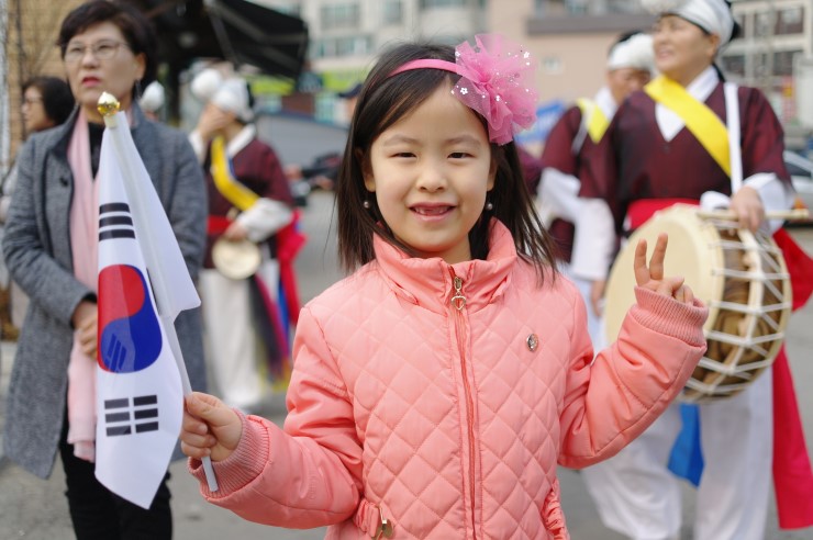 ▲ 오산 세미 초등학교 1학년 김가희 학생. 태극기를 보면 어떤 생각이 떠오르는지 작은 소녀에게 물었다. 예쁜 미소로 화답을 하는 소녀의 작은 미소가 인상 깊었던 날이었다. 엄마와 함께 3.1절의 의미를 생각하며 참여해 보니 재미있었다고 말한다. 만세 운동 재현 행사에서 유난히도 밝은 미소가 눈에 띄었던 김가희 학생. 98년 전 이곳, 오매장터에서 일어난 우리 민족의 저항 운동 재현 행사에 함께 할 수 있어서 더없이 뿌듯했던 날이었다.