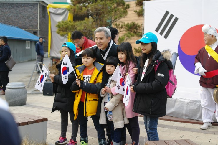 ▲ 만세 운동 재현에 함께 참여한 학생들과 함께 기념 촬영 중 . 많은 어른들과 함께 만세 삼창을 하며 오매시장을 돌았다. 만세 운동 재현 행사를 지켜보면서 아이들의 웃음이 떠나지 않고 지금까지 이어질 수 있었던 이유 중의 하나를 보고 있는 듯했다.