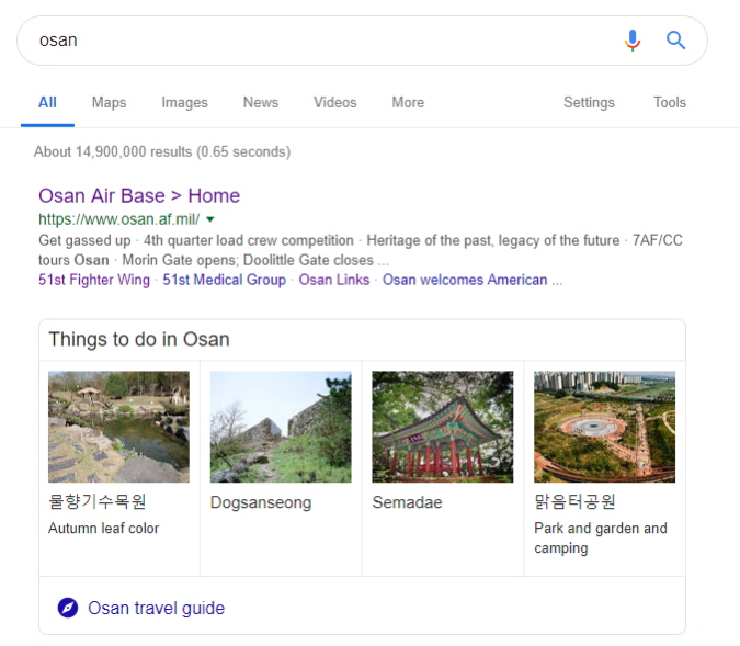 그리고 마지막 글로벌하게 Osan 을 검색해보았습니다 !! 아쉽게도 Osan 의 영문지역명은 검색이 되지 않네요. 그 검색의 중심에선 Osan Air Base ! 지난번 기사화했던 오산 공군 비행장이 대부분 검색됩니다. ^^ 그럼 시민분들도 오산과 관련하여 잘 알고 있는 내용이 있다면 댓글로 공유해주시면 더 좋을 것 같네요 !
