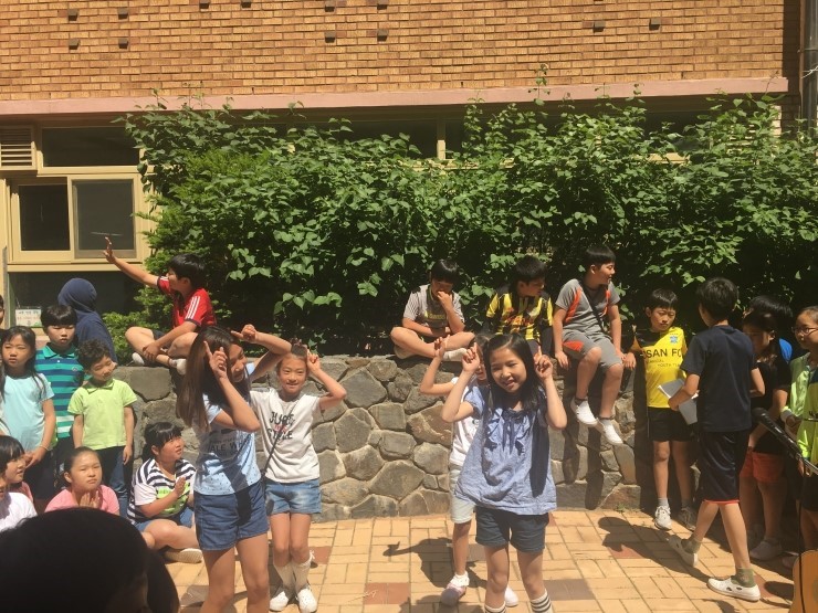 ▲ 통기타 연주로 아이들과 소통하고 있는 이종우 교장선생님(위), 친구들 앞에서 춤실력을 뽐내는 필봉초 학생들(아래) 아이들이 어려서부터 음악 속에서 성장하고 연주하고 노래하면서 감성과 인성이 함께 자란다면 정말 멋지고 의미 있는 교육이 아닐 수 없겠죠.