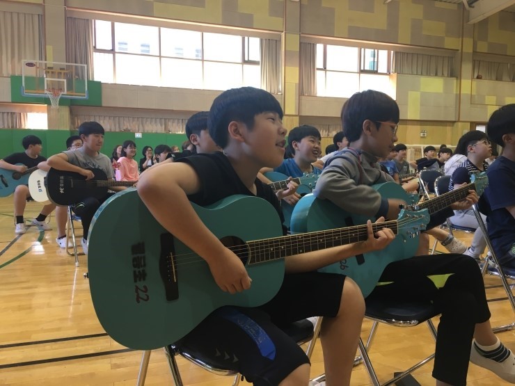 ▲ 기타를 연주하며 즐거워하는 학생들 특별했던 일일 통기타 수업에 참여한 곽상욱 오산시장과 안민석 국회의원은 코드를 익히고 자신있게 연주하는 학생들을 보며 많은 박수와 응원을 아끼지 않았고, 학부모들도 아이들의 모습을 뿌듯하게 바라보며 노래 속 동심으로 함께 빠져들었습니다.