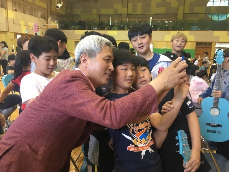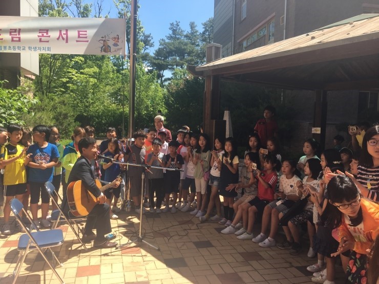 5월 26일 오전부터 신나는 기타 선율이 교정에 울려퍼집니다. 커다란 통기타를 품에 안은 아이들은 앳된 손마디에 활짝 핀 웃음을 담아 기타 줄을 튕깁니다. 오늘은 오산시 필봉초등학교 대강당에서 특별한 수업이 진행되었는데요, 한국 음악계에 포크 열풍을 일으킨, 쎄시봉의 멤버인 가수 윤형주씨가 필봉초등학교 6학년 학생들의 1일 통기타 선생님으로 깜짝 등장했습니다.