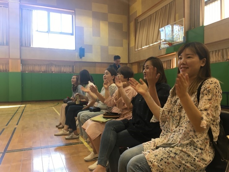 ▲ 가수 쎄시봉 멤버 윤형주씨의 재능기부 수업에 참관한 학부모들이 환호하고 있다. 어느덧 한 시간이 훌쩍, 초등학교 4학년인 손주와 함께 기타 연주를 한다는 윤형주씨는 필봉초등학교 학생들에게 인생의 교훈도 들려줍니다.
