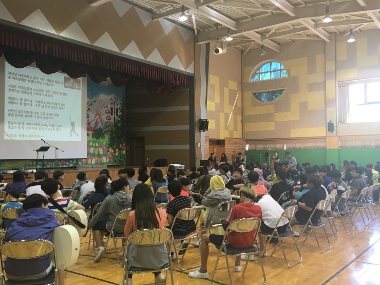 ▲ 마지막으로 통기타 실력을 발휘하기 위해 대강당에 모인 필봉초 6학년 학생들 올해 3월부터 10주 동안 2시간씩 통기타를 배워온 6학년 학생들이 마지막 수업을 위해 한 자리에 모인 만큼 새로운 손님의 등장은 학생들에게 큰 관심이 아닐 수 없었어요. 이날 윤형주씨는 직접 작사 작곡한 ‘조개껍질 묶어’와 ‘길가에 앉아서’의 코드를 하나하나 가르쳐주며 함께 통기타 연주를 하는 등 의미있는 시간을 가졌습니다.