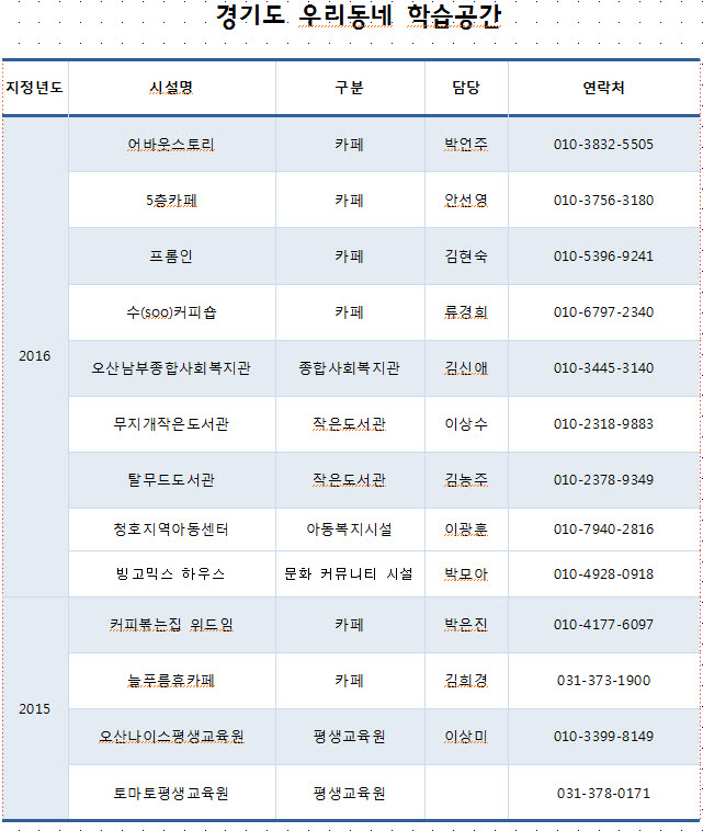 기존의 커피볶는집 위드임, 늘푸름 휴카페, 오산나이스평생교육원, 토마토평생교육원 4곳과 합하여 모두 13곳의 학습공간이 생겼지요. 이미지가 안보이는 분들을 위해 아래에 다시 적어봅니다.