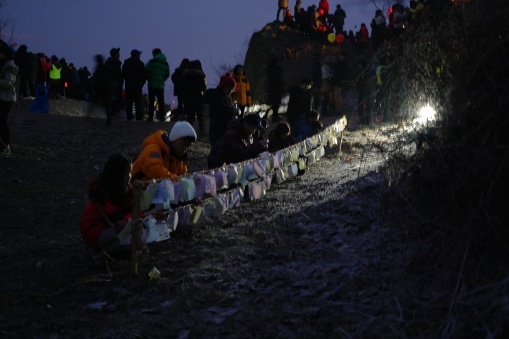 ▲ 한 목소리로 카운트다운을 외치며 소망 풍선 띄우기 행사장 가까운 곳에 고사리 같은 손으로 꾹꾹 눌러 쓰며 적어 내려갔을 '소원' 메모를 걸어두는 소녀가 눈에 보였다. 부모님의 손을 잡고 이곳까지 올라왔으리라. 한참 꿈나라로 소풍 갔을 어린 소녀가 소원 메모지를 걸고 있는 모습이 잔잔한 감동으로 전해왔다.