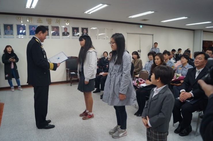 ▲ 불조심 공모전에 입상한 학생이 표창을 받고 있다. 우로부터 김민수, 유리아, 김지원 학생 또한, 불조심 공모전에 입상한 김지원(문시중) 등 3명의 학생도 표창을 받았다.
