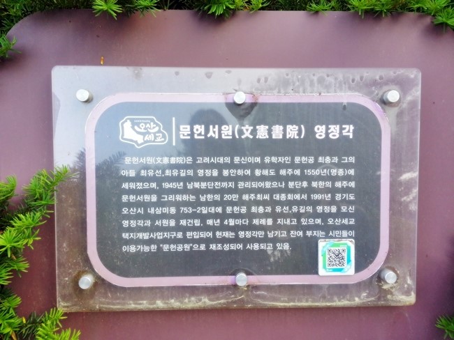 [문헌서원 영정각] 경기도 오산시 내삼미동에 있는 서원. 고려시대 문신, 유학자 최충(崔沖, 984~1068년)과 그의 아들인 최유선(崔惟善), 최유길(崔惟吉)의 영정을 봉안하고 있다. 본래 1550년(명종 5) 황해도 해주에 처음 건립되었으며 이후 여러 차례의 중수를 거쳐 1945년까지 보존되어 왔다. 이후 남북이 분단되어 해주 최씨 종중에서 오산에 다시 건립하였다. 서원 규모는 부지 12,213㎡, 영정각 89.1㎡, 서원 330㎡이다. 경내에는 영정각과 강당을 겸한 2층 건물이 있는데, 영정각은 정면 3칸, 측면 2칸의 구조로서 청기와를 얹은 팔각지붕의 건물이며 1991년 건립하였다. [네이버 지식백과] 문헌서원 [文憲書院] (두산백과)