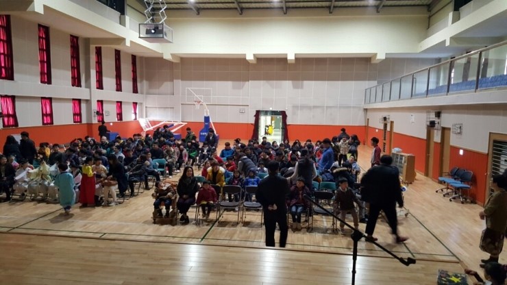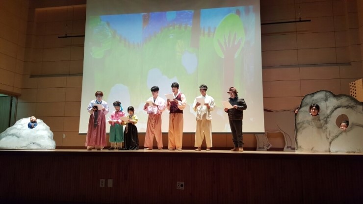 공연은 10시 30분인데 9시가 안 된 시간에 모두 모여 있네요. 대본을 보며 연습을 하는 아이들은 여유로운데 오히려 엄마들이 더 긴장이 되는지 아이들에게 읽히고 또 읽히며 걱정을 덜어내고 있어요. 오늘 연극에는 학생 18명과 학부모, 극단 됴화 단원들이 함께할 거래요.