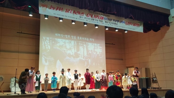 ‘오산의 설화와 역사를 찾아서’라는 주제로 지난 8월 30일부터 4개월 동안 매주 일요일마다 준비를 했답니다. 미술 선생님과 함께 무대장치로 쓸 시뮬레이션을 만들고, 문인협회 선생님 안내로 독산성이랑 고인돌, UN군 초전비를 트레킹하며 우리 오산의 역사를 배웠어요. 국악 선생님이 쳐주시는 장단에 맞춰 연극 연습을 열심히 하던 아이들의 모습은 늘 즐거움으로 가득했습니다. 오늘 공연은 금암동 고인돌 공원에 있는 ‘여계산의 전설’, 부산동 가마뫼에 있는 ‘선바위 전설’, 독산성의 ‘독산성-권율장군 이야기’랍니다.