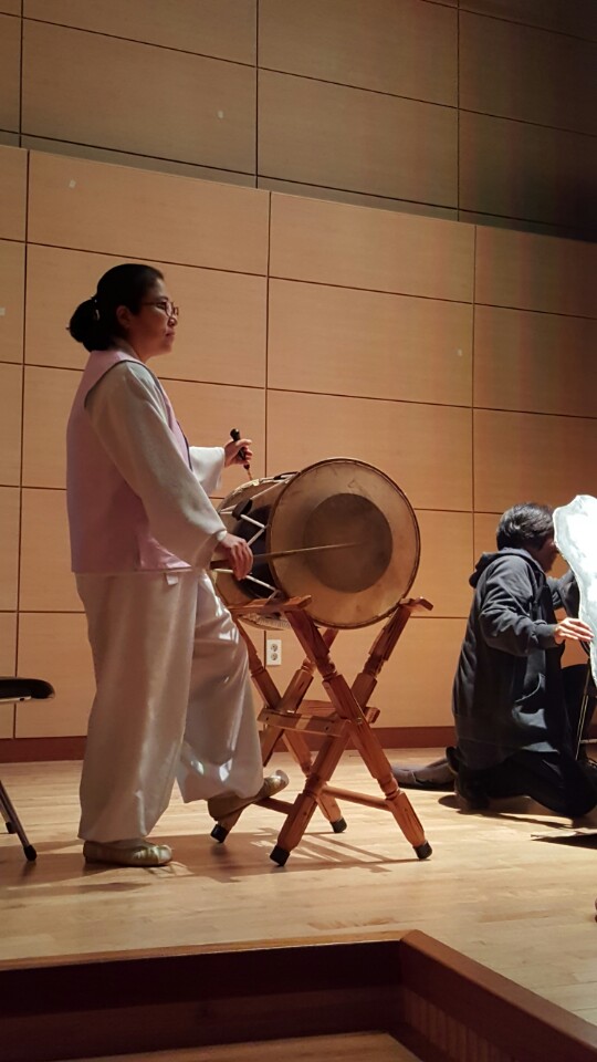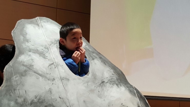 두 번째 무대는 낭독공연인 ‘선바위 전설’입니다. 소금장수가 제물포 상인들한테 촌놈이라고 바가지 쓴 것을 재치 있게 되갚아 주는 얘기예요. 낭독공연은 잠시 눈을 감고 감상을 하는 것도 좋을 것 같아요. 라디오를 듣는 것 같거든요. 이화정 선생님(사단법인 한국연극협회 오산시지부 지부장)은 공연에 앞서 관객들에게 공연 때 사용되는 우리 장단을 알기 쉽게 설명해 주시더니 성심학교 친구들을 선바위 얼굴로 등장시켰어요. 친구들이 아주 좋아하더라구요. 이런 것이 연극의 묘미가 아닐까요?