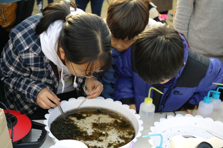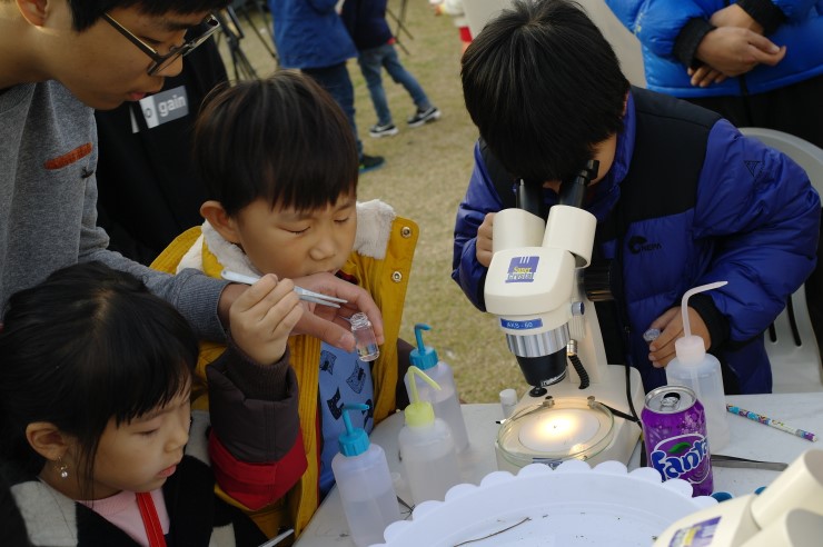 ▲ 물땡땡이 체험장에서 줄날도래를 직접 현미경으로 관찰하는 모습이다. 이날 현장에서 현미경 관찰을 처음 해본 학생은 마냥 신기했다고 말했다. 알코올 냄새가 시큼했지만 누나들의 친절한 안내에 따라 관찰해보니 어렵지 않았다고 말했다.