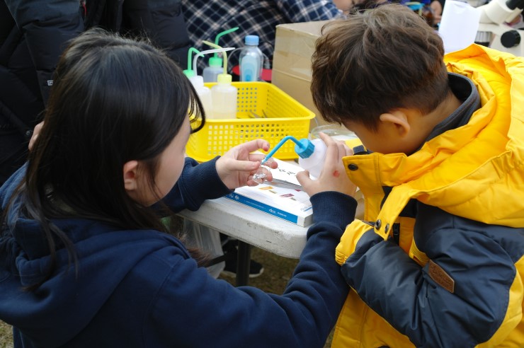 ▲ 오산천에 살고 있는 "줄날도래" 관찰 중, 운암중 수생태 물땡땡이 동아리 학생 1 박다람 학생이 초등 학생 8살 친구에게 알코올을 담는데 도와 주는 모습이다.