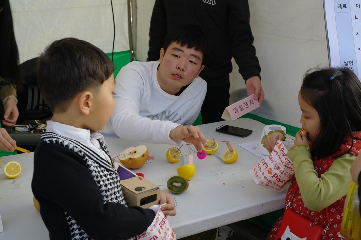▲ 운천 중 과학 실험 반 , 화학 전지(과일 전지) 만들기 , 과일 전지를 통해 전기의 원리를 어린 친구들에게 자세하고 친절하게 가르치며 알려주는 과학 동아리 학생의 모습이다.
