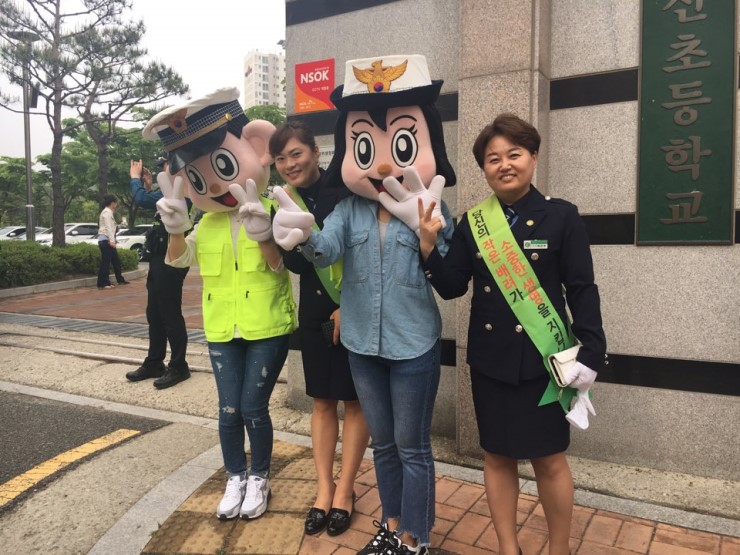녹색어머니들과 함께 귀엽고 늠름한 포돌이, 포순이가 등교하는 어린이들을 웃으며 맞아 주고 있어요^^