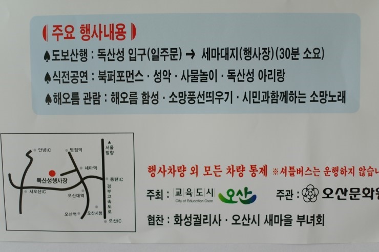 행사 차량 외 모든 차량은 통제되며 셔틀 버스는 운행하지 않는다는 점을 더 기억하시면 되겠습니다. 독산성 입구에서 세마대지 행사장까지 도보로 30분정도 소요되오니 도보산행을 하시면서 한 해 계획을 생각하시는 것도 좋을 듯 합니다.