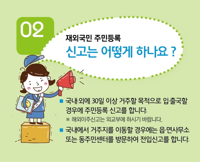 재외국민이 국 · 내외에 30일 이상 거주할 목적으로 입 · 출국할 경우에는 거주지 읍면동에 신고를 해야한다고 해요!