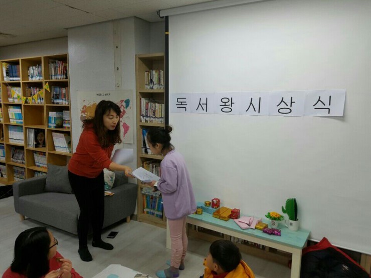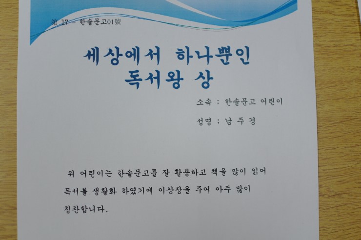 ▲ 평생 학습 마을 한솔 문고는 자체적으로 문고를 활용하고 책을 많이 읽는 아이들에게 상장과 상품을 수여하고 있다.