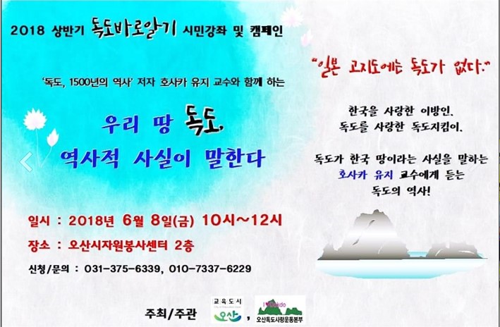 지난 6월 1일(금) 오산독도사랑운동본부(회장 김용원)에서는 독도의 영토주권수호 의지와 독도역사를 배울 수 있는 독도교육관 조성 및 커뮤니티공간을 새롭게 단장하고 개소식 행사를 가졌다. ![]() 오독사(오산독도사랑운동본부)는 우리 땅인 독도를 바로 알리고 지켜 나가고자 하는 시민들이 모인 자발적인 시민봉사단체로 2015년 1월에 출범되었다. ![]() 이에 따라 자라나는 학생들에게 올바른 역사관 정립을 위한 독도골든벨 행사와 독도사랑운동의 날 캠페인, 어린이날 등 각종 축제에서 독도사랑 홍보와 독도스터디 운영, 독도탐사를 통해 독도지킴이 봉사활동을 꾸준하게 실시하였으며 이에 동참하는 시민들 또한 꾸준히 증가하고 있다. ![]() 이날 행사에는 관계자 및 회원들이 참석, 컷팅식과 함께 김용원 대표의 인사말과 오산시자원봉사센타 유관진 이사장의 축사, 독도사랑에 대한 축시 낭송, 우쿨렐레 공연으로 모두가 축하하며 의미있는 시간을 가졌다. ![]() 진행을 맡은 황미옥 담당자는 “향후 독도역사교육강사 배출을 위한 커리큘럼 및 역량강화 프로그램을 운영하며, 쉽게 접하기 힘든 독도역사자료 및 서적, 사진 등을 열람할 수 있도록 하며, 독도 역사를 학습하는 공간의 장이 될 것”이라고 말했다. ![]() 또한, 6월 8일(금) 10~12시, 오산시자원봉사센터 2층에서는 ‘우리땅 독도, 역사적 사실이 말한다’라는 주제로 시민강좌가 진행될 예정이다. ![]() |