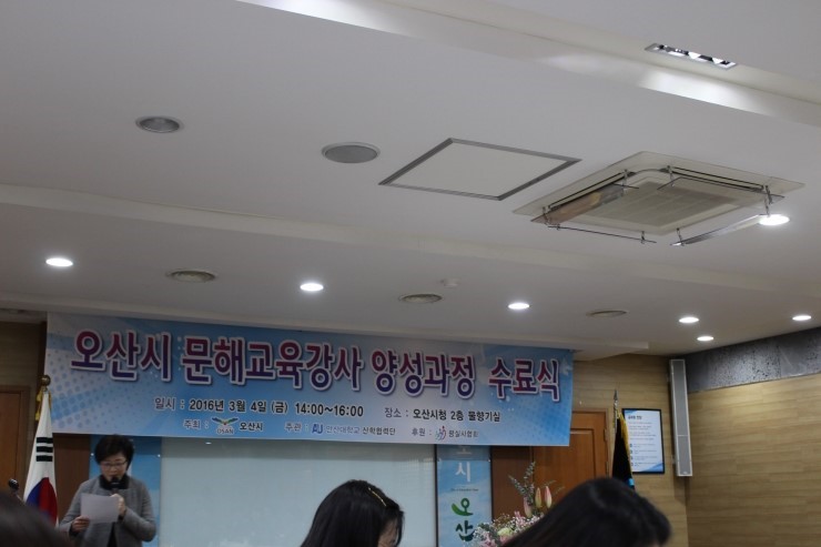 오산시청 2층 물향기실에서는 지난 3월 4일 오후 2시부터 <문해교육강사 양성과정> 수료식을 개최 했습니다. 평생교육을 주관하는 평실사협회 후원으로 지난 2월 16일부터 3주간 총 40시간의 숨가쁜 일정을 달려 왔습니다. 이번 교육은 문해교육 전문가로부터 문해교육 개론,문해학습자의 이해,문해교육의 실제,문해교사의 역할등을 학습했으며, 모두 35명이 수료하게 되었습니다.