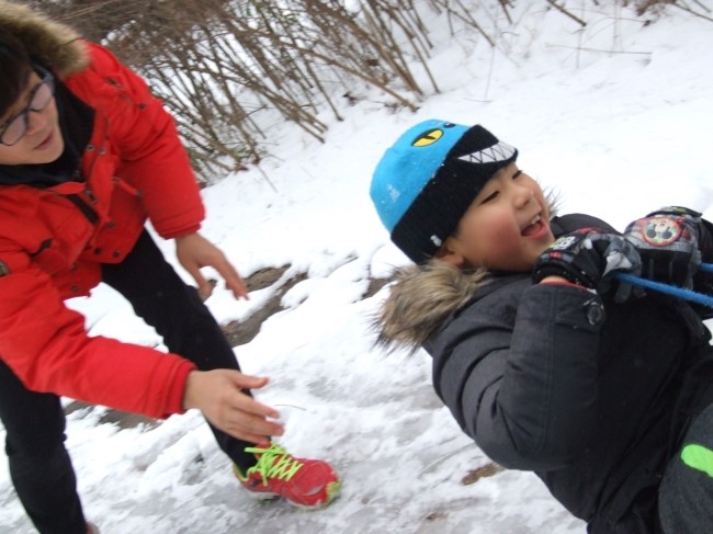 오늘 방과 후 시간도 없는데 한참 지나도 오지 않는 아이를 기다리고 기다리다 참다 못해 나왔다. 놀이터를 한바퀴 돌아도 보이지 않아 설마 추운데 저 뒷동산에 갔으려고..혹시 몰라 가봤더니 역시나~ 아~! 여계산 입구 산책로가 눈으로 덮혀 자연 눈썰매장이 되었다.