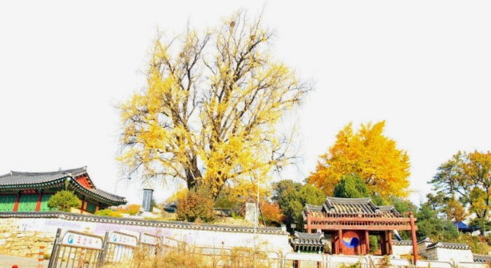 ![]() - 공자의 영정이 모셔져 있는 궐리사 입구 그로부터 270년후 그곳에서 은행나무가 싹을 틔우더니 엄청난 속도로 자랐고 정조가 공씨 가문에 얽힌 이야기를 듣고 그곳에 궐리사라르 지으라고 명했다고 전해진다. 궐리사 문앞에가면 제일먼저 그 신기한 이야기의 주인공인 은행나무가 풍성한 노란잎으로 우리를 반겨준다.