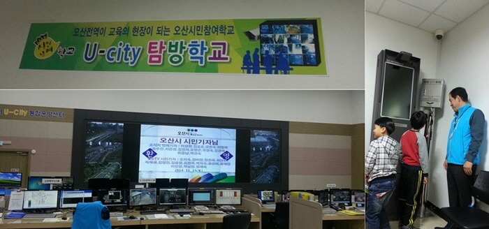 4코스 - 오산 U-City 통합운영센터 오산 U-City 통합운영센터는 오산시에 설치되어 운영중인 영상정보시스템(CCTV), 교통정보시스템(버스정보안내, 신호제어, 불법주정차)등을 공간적으로 통합하여 모니터 요원이 365일 24시간 실시간 관제를 통해 시민의 안전과 재난재해 위험으로부터 사전 예방 및 사후처리와 신속한 교통정보를 제공하는 센터이다. ![]() - 오산시민참여학교 프로그램을 통해 600명이 넘는 아이들이 유시티를 탐방했다.