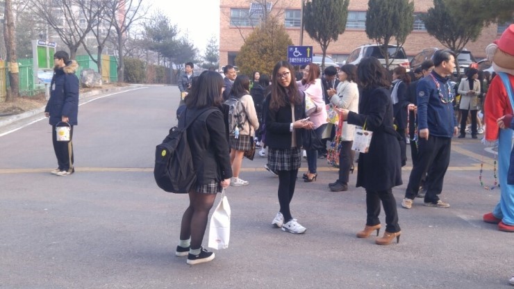 3월 14일 화이트 데이! 하지만 오산 원일 중학교에서는 매년 이날을 다른 의미의 Free Hug Day로 정해서 등교시간이 떠들썩합니다. 등교 맞이를 하러 교장선생님과 교감선생님, 각 한년 담임선생님이 일찌감치 나와서 [당신의 지친 마음을 안아드립니다], [소중한 당신을 따뜻하게], [토닥토닥 FREE HUG] 라고 씌여진 피켓과 사탕바구니를 들고 학교정문에서 기다리면 등교시간(08:20~08:50)에 맞춰 학생들이 하나 둘 교문 안쪽으로 들어오기 시작합니다.