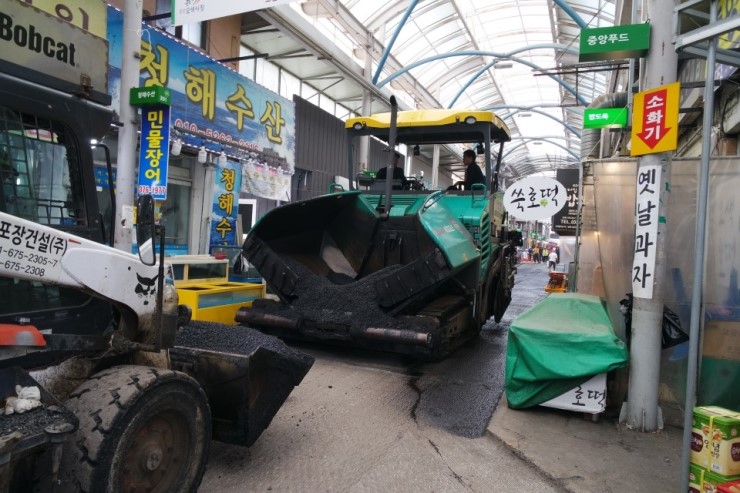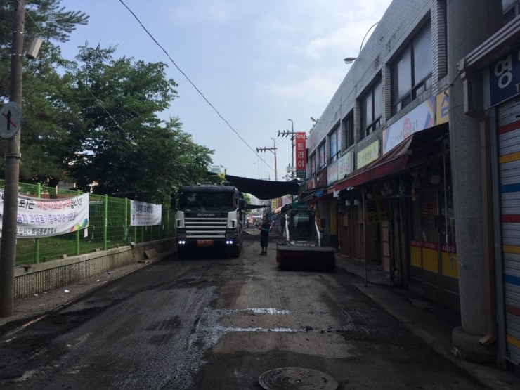 뜨거운 날씨인데도 도로 파손 및 평탄성 불량으로 불편을 겪었던 오색시장 내 불량 구간을 작업하는 작업자들은 오색시장의 새단장으로 천객만래를 기원하며 작업 중이다.