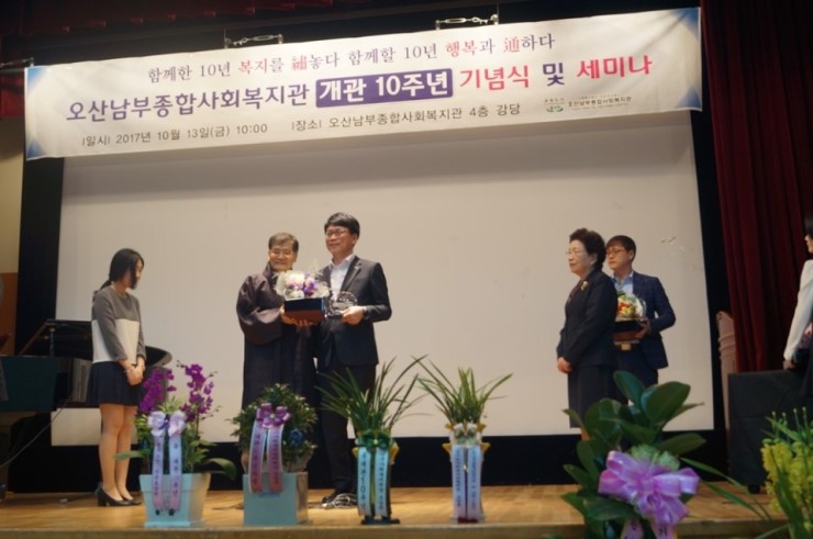 1부 행사로 복지유공자 표창에 이어 신영묵 관장은 기념사를 통해 흘러간 10년을 회상하며 “그동안 성장 발전한 배경에는 복지정책에 특별히 심혈을 기울여 준 오산시장과 복지 현장 종사자의 공로가 많다.”라면서 “복지관 종사자들은 원불교의 사회복지 정신을 받들어 고품격 복지 실현을 위해 중단없는 노력을 하겠다.” 라고 말했다.