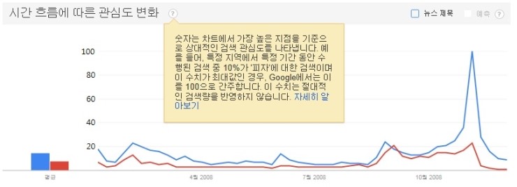 ▲ 2008년도 대선 전 오바마와 미트롬니의 관심도 비교 (파란색이 오바마 대통령)