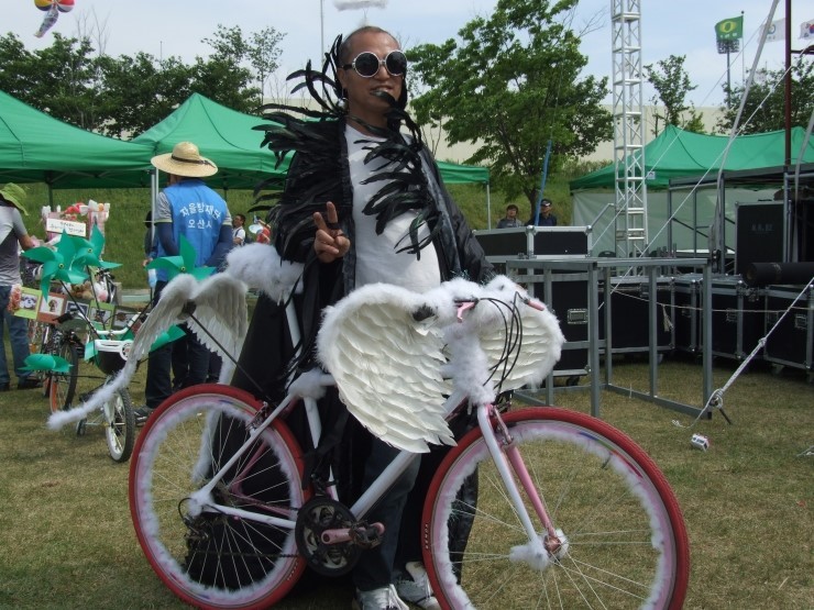 ▲ 코스프레를 연출한 참가자들이 오산천으로 들어오고 있다. 따르릉~ 따르릉 비켜주세요~ 오늘은 내 자전거가 주인공~! 멋진 코디, 스타일리스트와의 만남을 통해 오산천으로 가는 내내 스포트라이트를 받은 개성 넘치는 자전거는 출품되어 심사 후 우수작품으로 수상하는 영광을 거머쥐기도 했답니다.